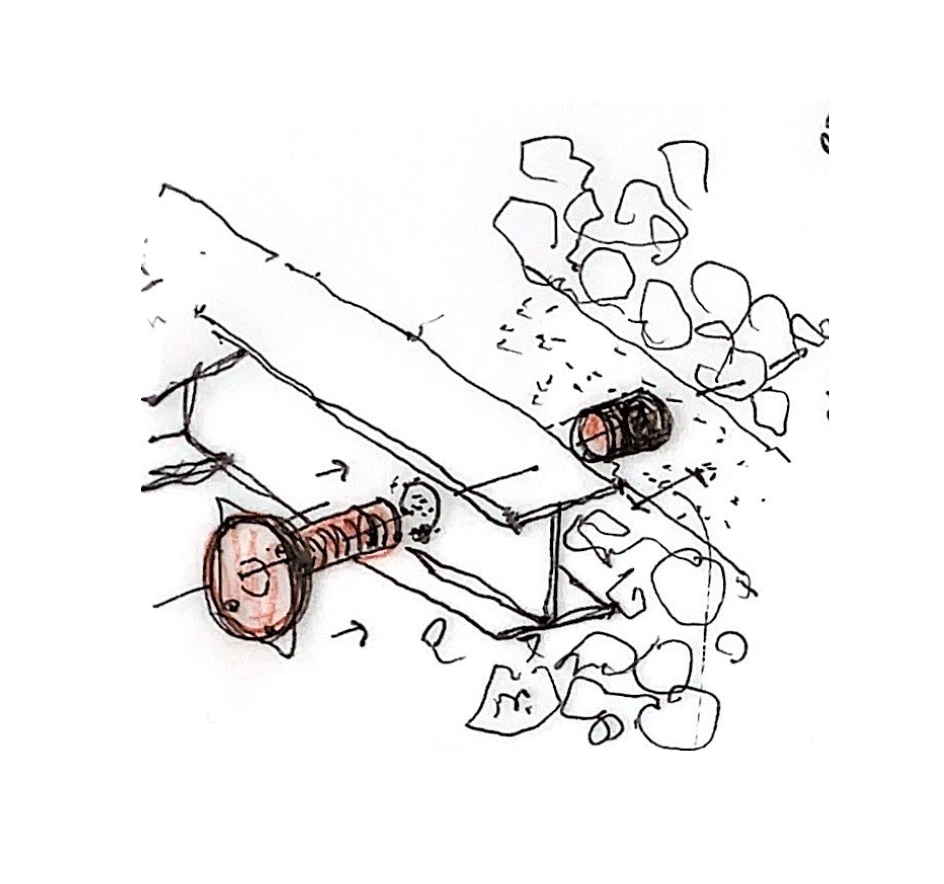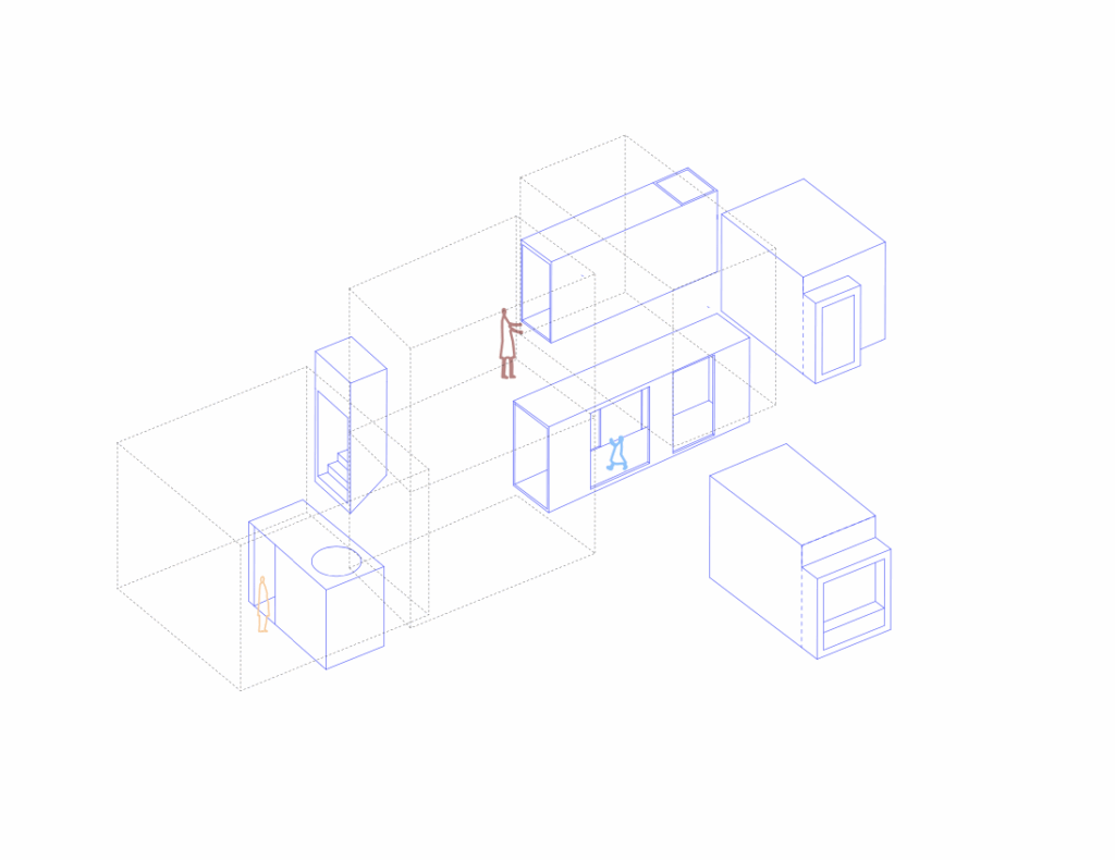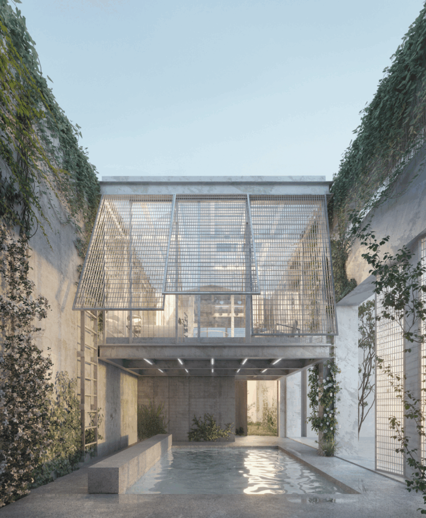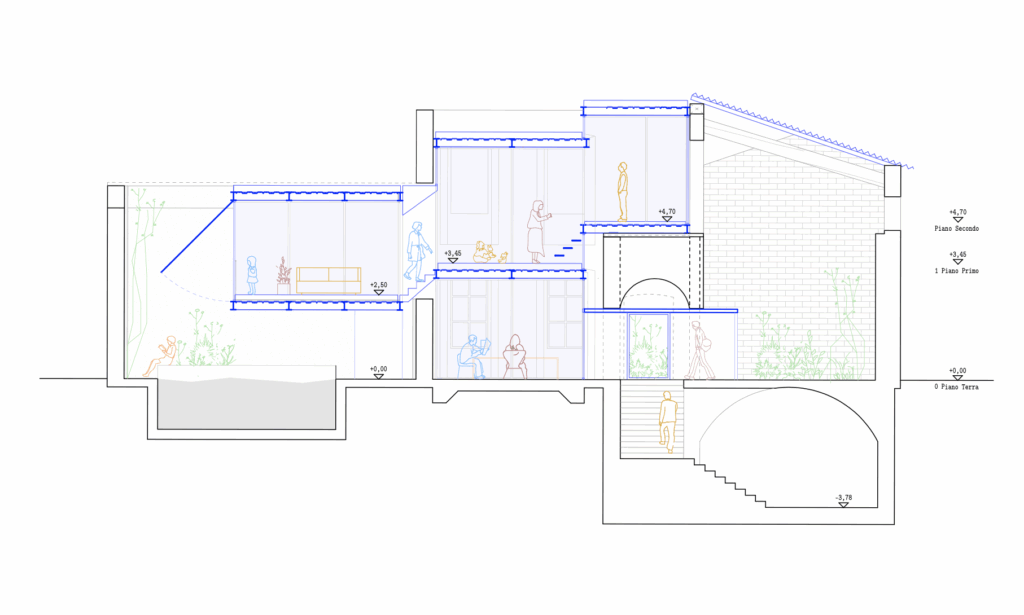Un luogo non progettato, indeciso o ambiguo, tra ciò che è interno e ciò che è esterno, tra ciò che è naturale e artificio, è un lavoro sul limitare. Si tratta di uno spazio di contrattazione tra la selva e l’artefatto. Sono spazi “residui” (2), precedentemente abitati, riconsegnati alla natura, dove la volontà è quella di cogliere questa naturalizzazione come una opportunità di spazio domestico in contatto con essa. I nuovi volumi metallici vibrano tra le vecchie pietre, dominate dalla natura e ci stimolano a guardare alla rovina in modo inedito, (3) con nuova percezione, abitandola a diverse quote. (4) Come una rovina piranesiana, avvolta nella vegetazione, e popolata di figure fantasmagoriche, i nuovi volumi assumono una dimensione ancestrale.