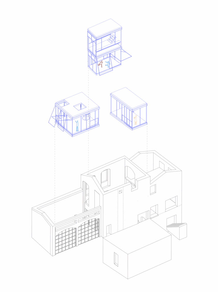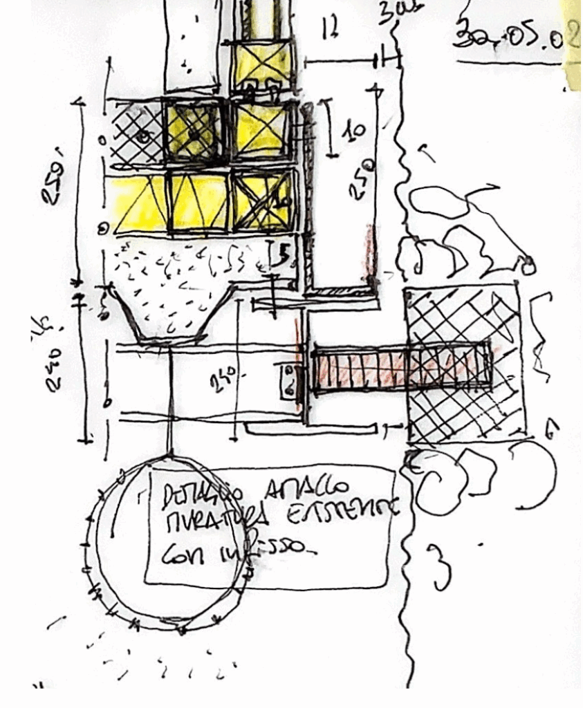 Nuovi volumi in acciaio e vetro instaurano una trattativa tra gli spazi che furono e quelli che saranno, tra spazi addomesticati (o domestici) e selvatici. La volontà è quella di calare all’interno delle vecchie mura nuovi volumi indipendenti, che lasciano la natura inalterata. E’un “microcosmo”, un “ortus conclusus”, un luogo separato dal resto del mondo, all’interno del quale avviene una delle più antiche forme di contrattazione tra natura e uomo. Si tratta di una azione arcaica, primitiva, un “do ut des”. “Se la costruzione aveva sottratto alla Natura un luogo, ora gli agenti atmosferici e le piante lo riportano, dopo tanti mutamenti, allo stato antecedente.